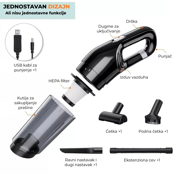 Usisivač za auto i kuću je kompaktan, bežični uređaj namenjen brzom i efikasnom čišćenju bez potrebe za velikim i glomaznim usisivačima. Idealan je za automobile, manje stanove, kancelarije i svakodnevnu higijenu prostora.