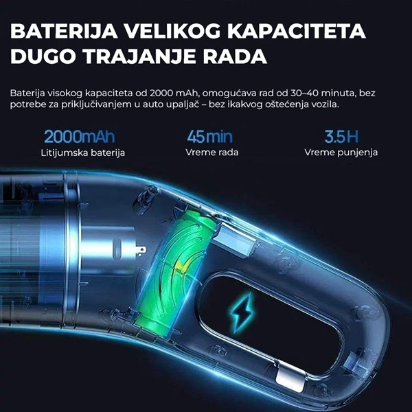 Njegov lagan i bežični dizajn omogućava brzo čišćenje bez kablova i ograničenja. Savršen je za unutrašnjost automobila, radne stolove, sofe, fioke i sve prostore gde je potrebna brza higijena bez komplikacija.