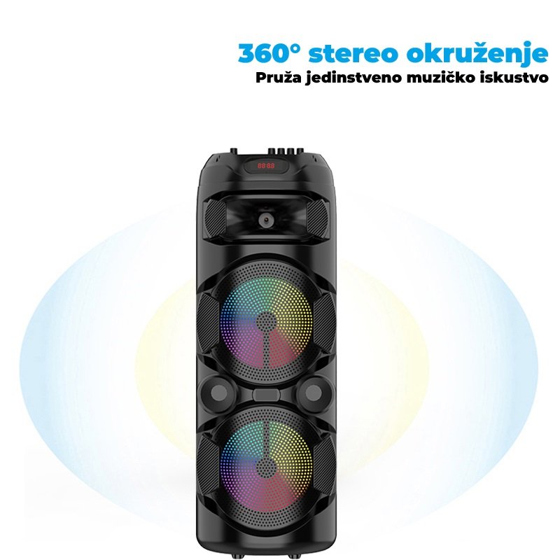 Bluetooth karaoke zvučnik sa RGB osvetljenjem pretvara svaku prostoriju u pravu žurku. Sa dva snažna 8-inčna vufera i dinamičnim svetlosnim efektima koji prate ritam muzike, ovaj zvučnik donosi moćan zvuk, energiju i vizuelni doživljaj koji podiže svako okupljanje.