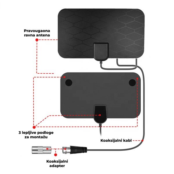 Antena se povezuje direktno na TV putem antenskog ulaza, dok se pojačivač napaja preko USB kabla. Nakon priključenja, pokrenite automatsko pretraživanje kanala i odmah uživajte u besplatnim Full HD programima.Idealna za: