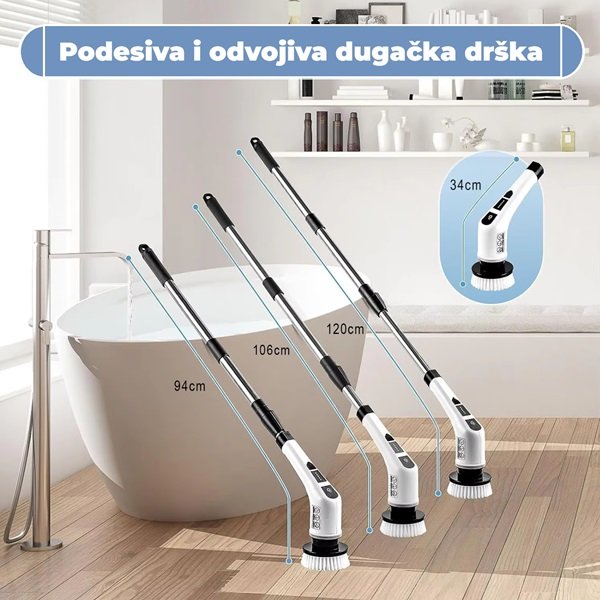 Električna četka za čišćenje 7u1 – moćan uređaj sa 7 nastavaka, produživom ručkom i USB-C punjenjem. Efikasno čisti kupatilo, kuhinju i auto bez napora i hemikalija.