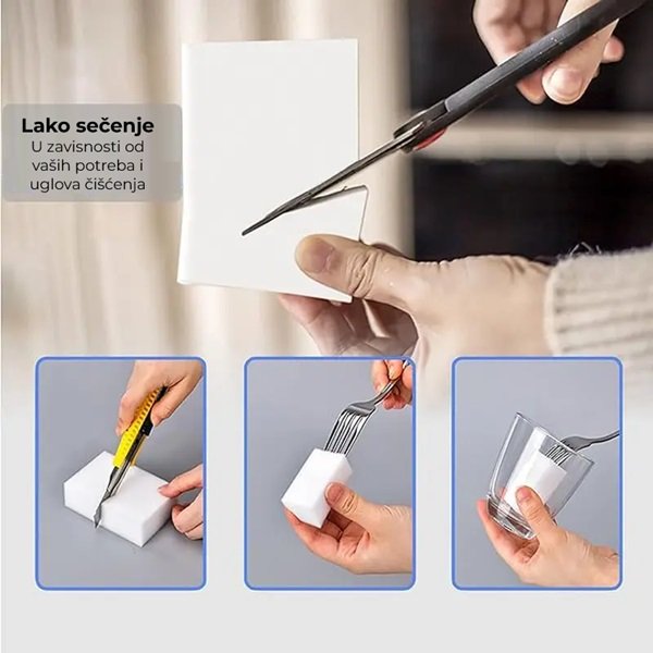 Sunđer se može seći po meri – klinovi, trake i mali komadi olakšavaju čišćenje uglova, fuga i uskih proreza.Ključne karakteristike