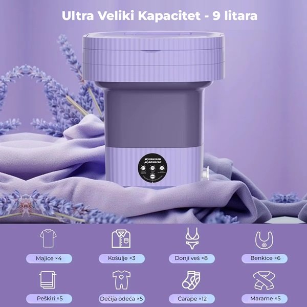 Mini sklopiva veš mašina – savršeno rešenje za brzo i praktično pranje manjih količina odeće. Kapacitet 9L, potrošnja samo 10W, ultrazvučne vibracije za nežno i efikasno pranje. Idealna za kuću, kampovanje i putovanja.