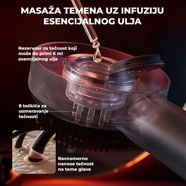 Ugrađeni rezervoar (6 ml) postepeno otpušta serum ili ulje dok masažni zupci rade, pa preparat dopire tačno do korena za bolju apsorpciju i negu.Crveno LED svetlo
