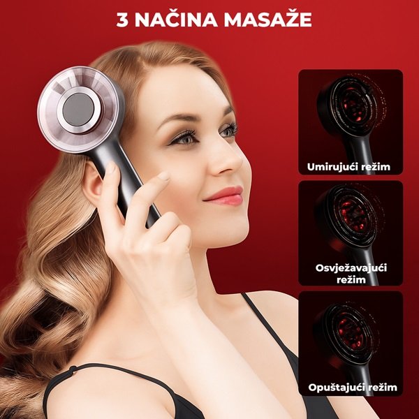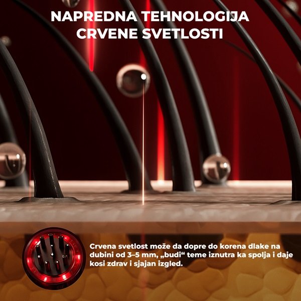 Crveno LED osvetljenje doprinosi osećaju topline i pomaže u stimulaciji kože glave, kao i u poboljšanju komfora tokom tretmana.Masažni zupci i udobnost u ruci
