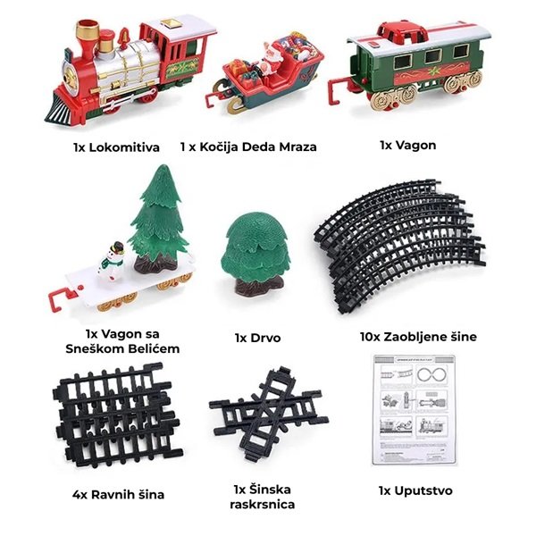 - Set uključuje šine, lokomotivu, vagon, sneška i jelku