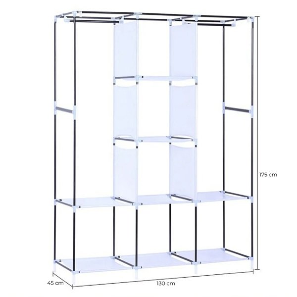 Platneni ormar 130×45×175 cm nudi dodatni kapacitet za garderobu, posteljinu i obuću, uz minimalnu zauzetost prostora. Prozračni prekrivač čuva odeću od prašine i vlage, dok čvrsta metalna konstrukcija obezbeđuje stabilnost i dug vek trajanja.Fleksibilna organizacija za različite potrebe