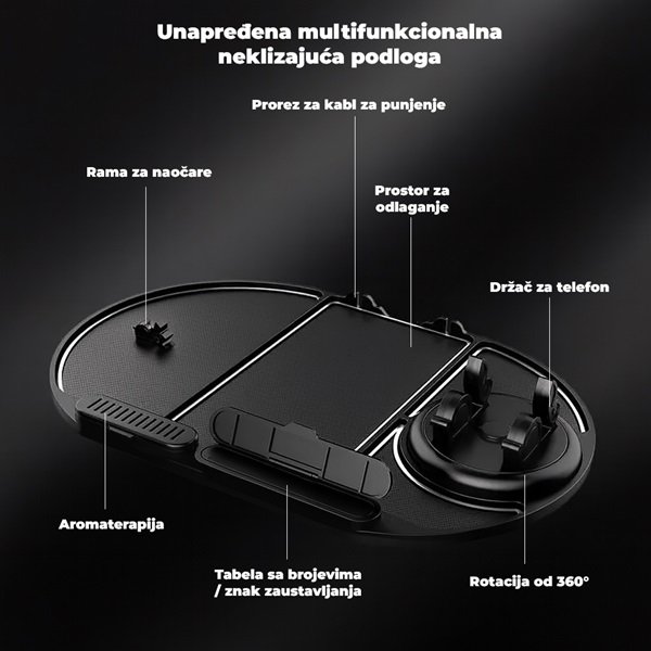 Podloga za telefon s rotirajućim držačem pruža sigurnu i praktičnu vožnju. Stabilna konstrukcija i 360° rotacija omogućavaju optimalan ugao pregleda telefona tokom vožnje.